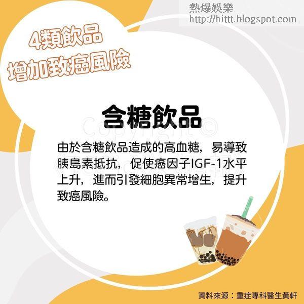 台灣重症專科醫生黃軒曾在其Facebook專頁上發文指出,有研究證實,全球每年有超過50萬例癌症與含糖飲料直接相關,另外一些非含糖飲品也可能存在致癌風險。他列出了以下4類可能增加致癌風險的飲品: