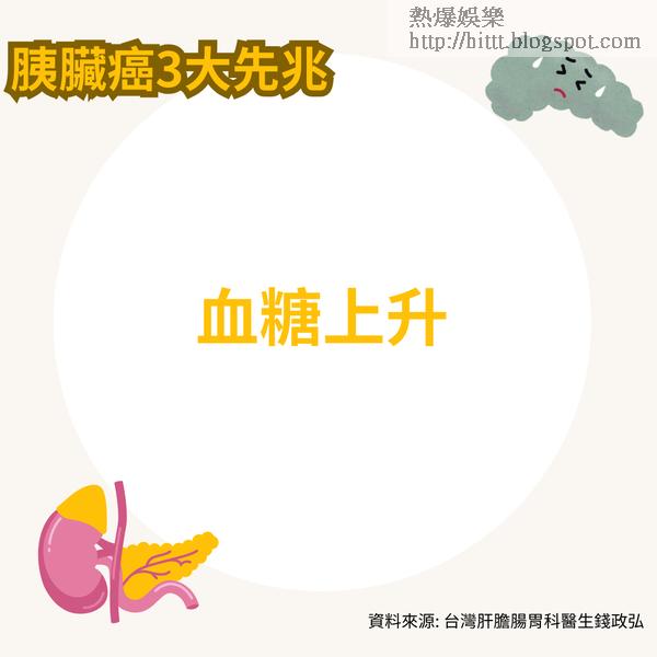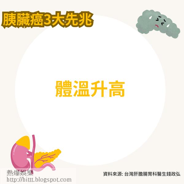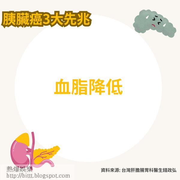 台灣肝膽腸胃科醫生錢政弘曾指出,胰臟癌常見有3大症狀,包括血糖上升、體溫升高與血脂降低。他解釋,血糖上升其實是胰臟癌常見症狀之一;體溫升高是因為癌細胞開始要出現的時候,會燃燒人體皮下脂肪,這時人體溫度就會上升;血而脂降低,是因為癌症會造成腸道吸收變差,所以膽固醇、低密度膽固醇和三酸甘油脂等血脂會下降。