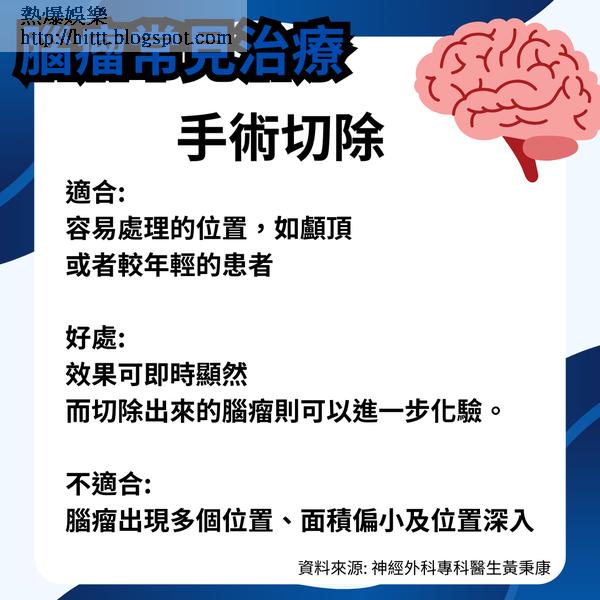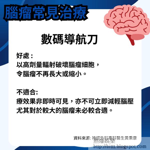 黃秉康表示腦腫瘤常見治療主要有2大類,包括是手術切除及數碼導航,前者一般效果可即時顯然,惟不適合: 腦瘤出現多個位置、面積偏小及位置深入;後者以高劑量輻射破壞腦瘤細胞,令腦瘤不再長大或縮小,惟治療效果非即時可見,亦不可立即減輕腦壓,尤其對於較大的腦瘤未必較合適。