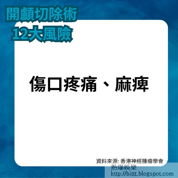 根據香港神經腫瘤學會資料,根據香港神經腫瘤學會資料,腦腫瘤並不常見,香港每年的新增病例約有1000宗,即每十萬人中約有15個人患病。而開顱切除術是一項高風險手術,手術後須密切監察病人狀況,若有不正常情況,須進行檢查,以便診斷手術併發症,並作出適當治療(包括手術及藥物治療)。傷口通常於一至兩星期內拆線。出院時間按照個別情況而定。出院後,大部份病人需要覆診,以檢查化驗報告及觀察後遺症。部份病人或需接受輔助治療,如放射治療或化療等。