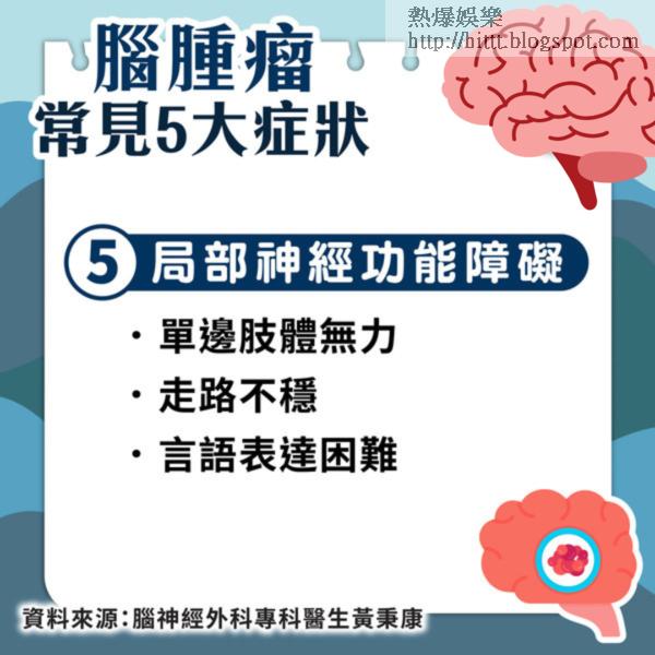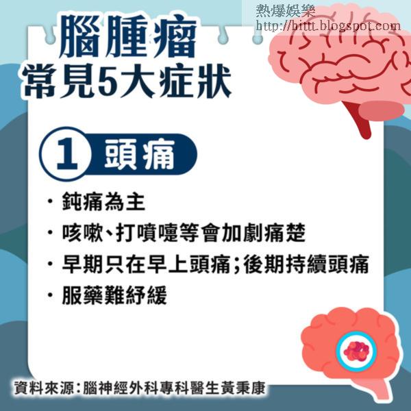 黃秉康指腦內一旦出現腫瘤,不講良性及惡性,腫瘤可以不斷長大,令腦壓上升,繼而令患者出現一連串不適,甚至影響患者語言、視力、聽力及運動能力。不過,他亦補充指部分良性腫瘤亦可以是毫無病徵,可能只是出現輕微頭痛,令患者掉以輕心。