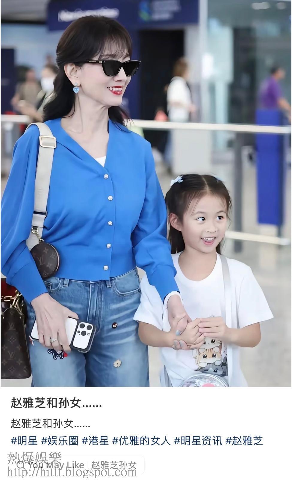 趙雅芝近日被發現拖住孫女現身機場。年過70的趙雅芝依然Fit到爆,身形瘦削,她穿上藍色上衣和牛仔褲,戴上副超星味十足!趙雅芝一手持電話,另一隻手拖住孫女,孫女笑容甜美,長得可愛,完全遺傳了趙雅芝的美貌!趙雅芝孫女完全不怕粉絲,對住鏡頭經驗老道,從容自若。發文網友指機場有十多人圍住趙雅芝影相,「身材好纖瘦,還簽(牽)着個小女孩,我以為是哪家富家太太帶着女兒」。