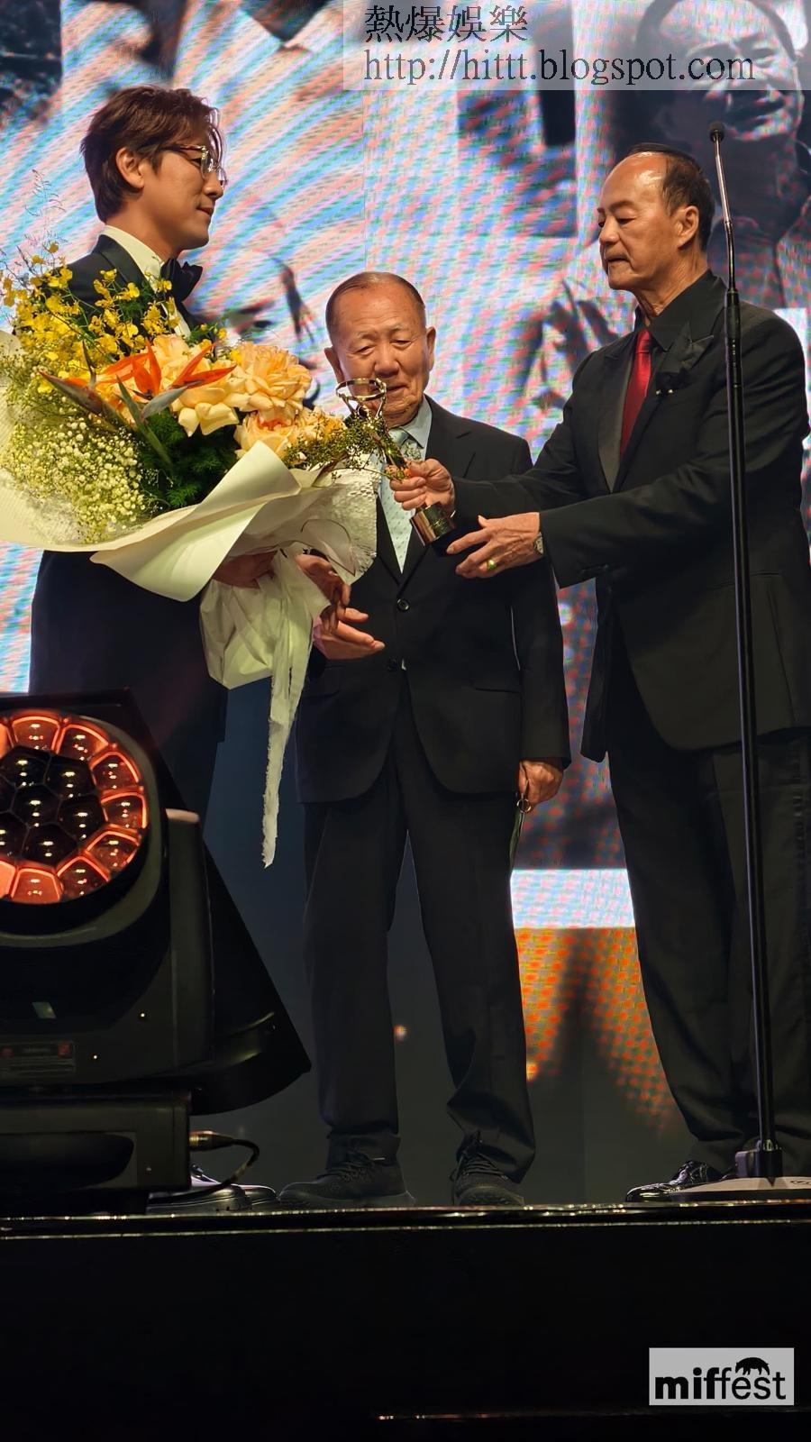 武打明星狄龍出席馬來西亞當地電影節頒獎禮,並獲得「終身成就獎」,兒子Shaun驚喜現身遞上獎座,父子深情互動感動眾人,而陪同出席的狄龍太太陶敏明,於後台與兩父子一同合照。(TVB)