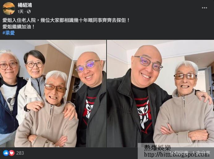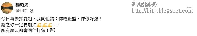 為了鼓勵愛姐繼續堅持對抗病魔,楊紹鴻在發文時特別寫下感言為她打氣:「今日再去探愛姐,我同佢講:你唔止堅,仲係好強!總之你一定要加油💪💪💪⋯⋯所有朋友都會同佢打氣!」 字裡行間充滿了對這位老前輩的敬重與疼惜。