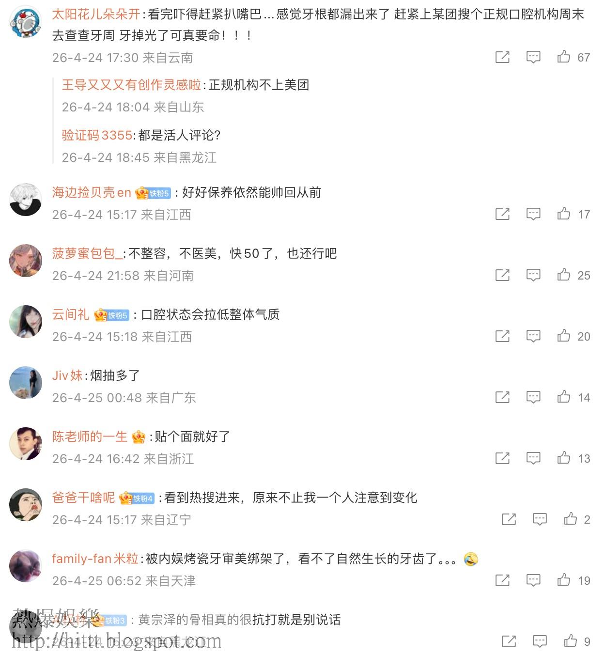 有大批粉絲看到片段後,都表示牙齦萎縮不能逆轉,對於黃宗澤的狀況都感到非常擔憂:「為什麼牙齒縫隙黑黑的」、「他牙一直不太好 以前剛出道還是亂牙」、「感覺牙根都漏出來了 趕緊去查查牙周 牙掉光了可真要命!!!」、「神顏硬生生被口腔狀態拖垮了」、「口腔狀態會拉低整體氣質」、「真的太紮心了!不注重護理牙齦,再好的底子也扛不住」、「看到熱搜進來,原來不止我一個人注意到變化」。不過有網民指,如果好好保養的話依然能帥回以前,亦有人指可能大眾看得太多藝人戴牙套,看不慣自然生長的牙齒。