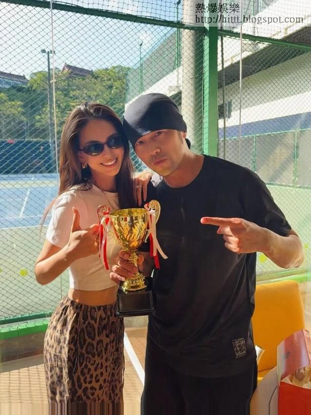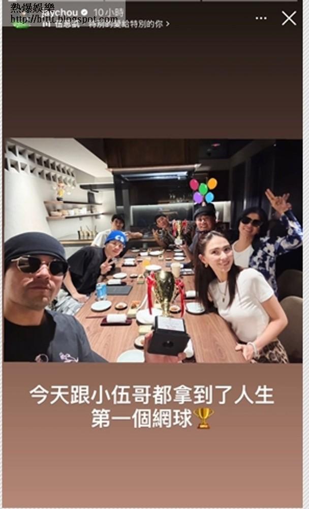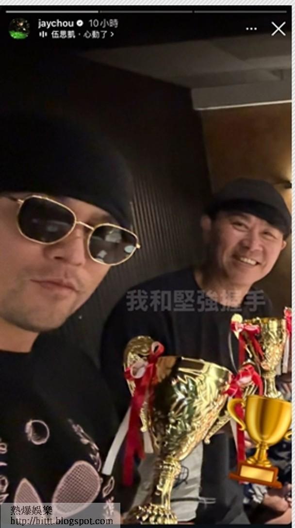 台灣天王周杰倫近年熱愛打網球,攞起網球拍打遍天下,終於得到實質榮譽回報。近日他透過社交平台宣布:「今天跟小伍哥都拿到了人生第一個網球獎盃。」興奮之情比起得到「金曲獎」不遑多讓,隔着屏幕也感受得到,見他與「小伍哥」伍思凱各握一隻獎盃之餘,又跟太太昆凌和一班好友吃飯慶功,氣氛熱鬧。而昆凌自以丈夫為傲,在社交平台分享與周杰倫合照,寫道:「聽說今天有人拿冠軍囉!」看來捧杯這個消息,是周家近來的頭等大事呢!