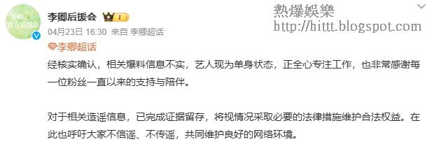 針對沸沸揚揚的戀情傳聞,李卿後援會今日火速發布聲明止血,嚴正表示:「經核實確認,相關爆料資訊不實,藝人現為單身狀態,正全心專注工作。」