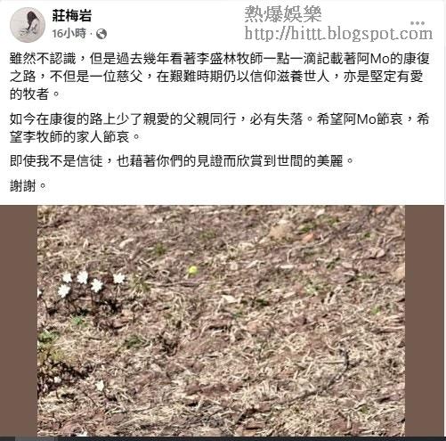 編劇莊梅岩心痛阿Mo在康復路上少了摯愛父親陪伴,一定會感到失落。莊梅岩在社交平台發文,指自己雖與李牧素未謀面,但過去幾年看他記錄阿Mo康復過程,深受感動。她稱李牧不僅是慈父,更是在艱難中以信仰滋養他人的牧者:「即使我不是信徒,也因你們的見證而看見世間的美麗。」她同時向阿Mo及家屬致哀,尤其心疼阿Mo:「如今在康復路上少了親愛的父親同行,一定很失落。希望阿Mo節哀,願李牧的家人節哀。」