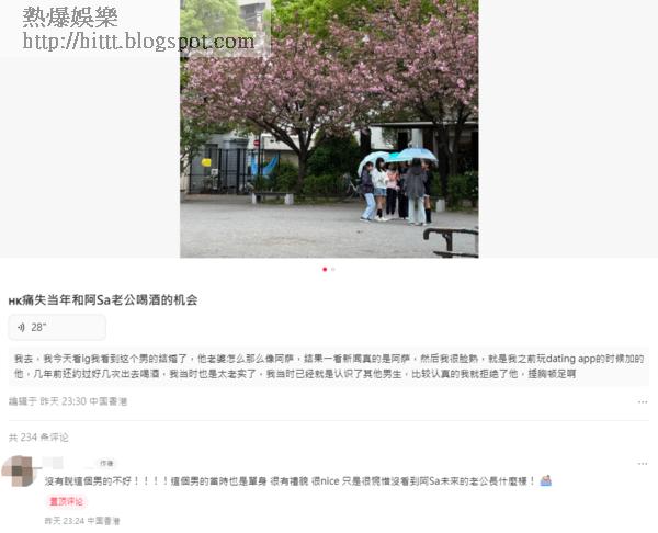 網紅以「痛失當年和阿Sa老公喝酒的機會」為題,表示:「我今天看IG看到這個難得結婚了,他老婆怎麼這麼像阿Sa,結果一看新聞真的是阿Sa,然後我很眼熟,就是我之前玩dating app的時候加的他,幾年前還約過好幾次出去喝酒,我當時有太老實了,我當時已經就是認識了其他男生,比較認真的,我就拒絕了他,搥胸頓足啊」。
