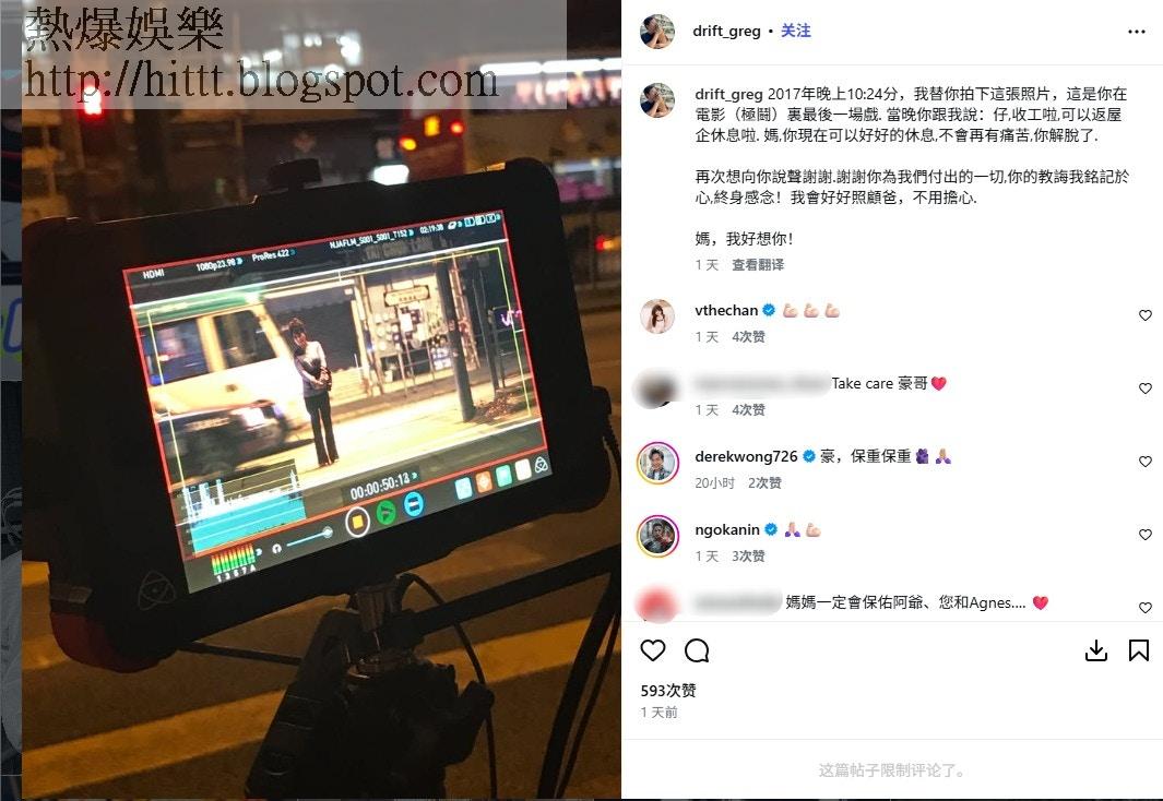 李泳豪在文中感性回憶,當晚10時24分,他親手替母親拍下這張工作照,那亦是施明在該部作品中的最後一場戲。當時施明溫柔地對他說:「仔,收工啦,可以返屋企休息啦。」這句原本平凡的日常問候,如今卻成了泳豪心中最沉重的道別。